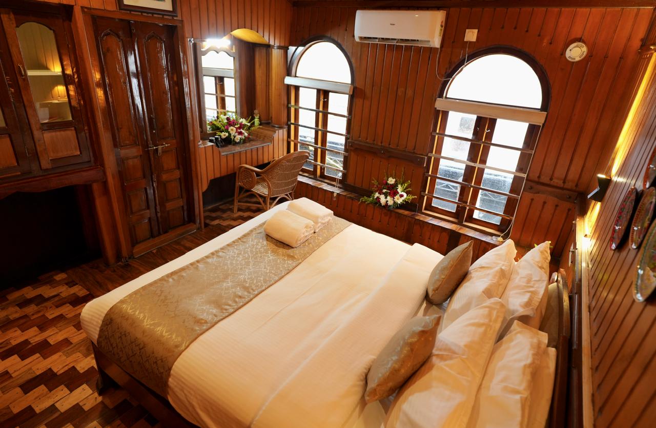The experience continues on the air-conditioned upper deck, where a refined dining space offers sweeping views of the backwaters—perfect for intimate dinners, quiet mornings, or family moments that linger.